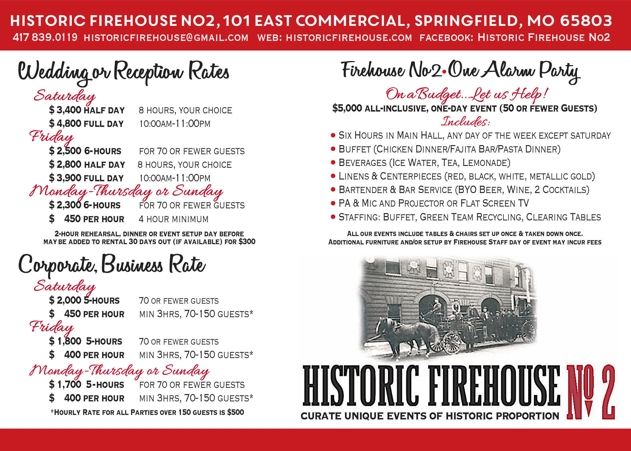 Bar Service: $50 per hour per bartender $150 setup/down fee; ends one hour before end time of event, with a five hour maximum. You bring your own alcohol for an open bar, served by our bartender(s). We allow beer, wine, champagne and two signature cocktails, no shots please. Firehouse bar service includes a filtered ice water self-serving station with recyclable plastic cups, ice and ice service where our Firehouse bartender(s) not only serve(s) your beer, wine and cocktails, they will also keep all your beverage canisters filled and iced throughout your event. CO2 and taps for kegs are also included in bar service and our glassware is available at $1 each…or feel free to bring your own.